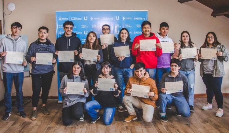 El jefe de Gabinete de la Municipalidad de Ushuaia, Omar Becerra, junto a la subsecretaria de Gestión Integral del Recurso Humano del Municipio, Gabriela Borré, entregaron certificados a alumnos y alumnas del Colegio José Martí que realizaron pasantías no rentadas en distintas dependencias municipales.